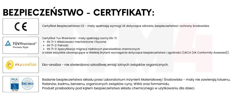 ** Maty jako odlew maszynowy wykonany z pianki EVA mogą posiadać na swojej strukturze zewnętrznej drobne defekty produkcyjne, które nie obejmują więcej niż 1% powierzchni maty lub dotyczą różnicy w grubości +/- 1-1,5mm – towar taki uznawany jest jako pełnowartościowy.